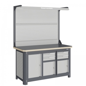 Верстак серии MECHANIC: MCN 1552.S799-2F состоит из столешницы шириной 1493 мм, рамы верстака, состоящей из опор, перемычек, боковых перфопанелей, малых модулей S7 и S9, двойного экрана с кронштейнами.
